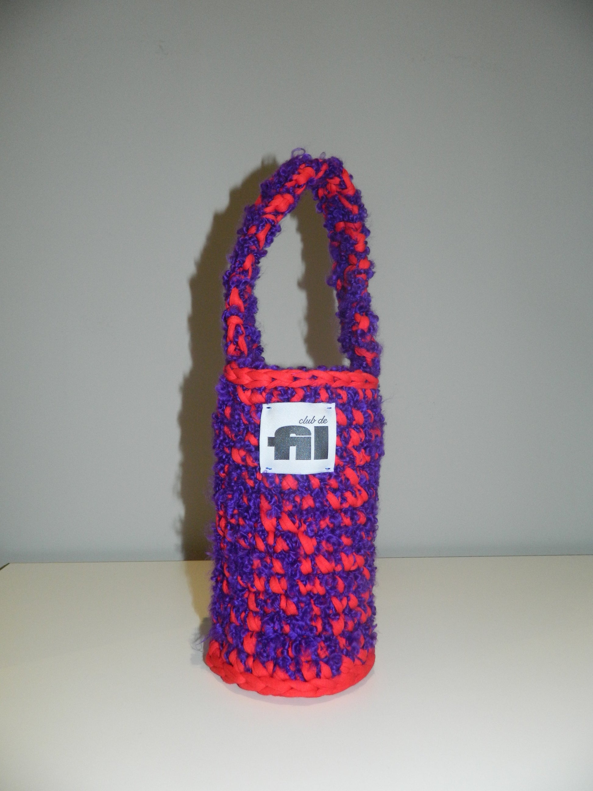 Panier 10 is a handmade crochet basket offered in stunning color combinations. Made from recycled t-shirt yarn and high-quality boucle yarn, this basket combines both style and functionality. Its wooden base adds extra sturdiness and makes it even more practical to use. Color combination: pomegranate t-shirt yarn and purple boucle yarn.