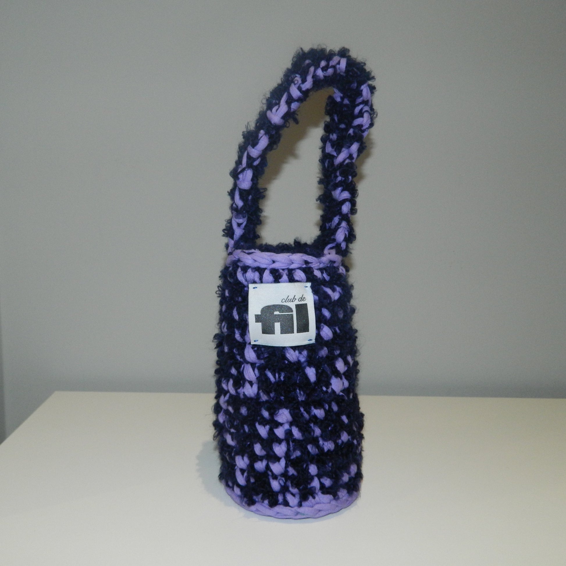 Panier 10 is a handmade crochet basket offered in stunning color combinations. Made from recycled t-shirt yarn and high-quality boucle yarn, this basket combines both style and functionality. Its wooden base adds extra sturdiness and makes it even more practical to use. Color combination: Lila t-shirt yarn and dark blue boucle yarn.
